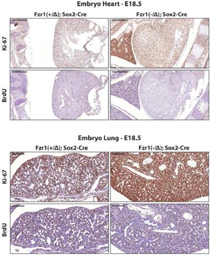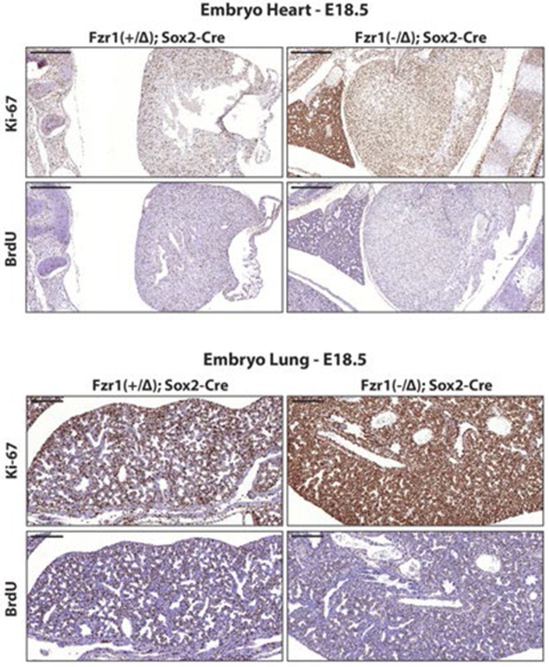 Figure 2—figure supplement 1. Ki-67 expression is restricted to proliferating cells by APC/C-Cdh1.Top, IHC staining of Ki-67 and BrdU in sagittal section of embryo heart (E18.5) of Fzr1(+/Δ);Sox2-Cre and Fzr1(-/Δ);Sox2-Cre mice. Scale bar, 500 µm. Bottom, IHC staining of Ki-67 and BrdU in sagittal section of embryo lung (E18.5) of Fzr1(+/Δ);Sox2-Cre and Fzr1(-/Δ);Sox2-Cre mice. Scale bar, 200 µm.DOI: http://dx.doi.org/10.7554/eLife.13722.005 |