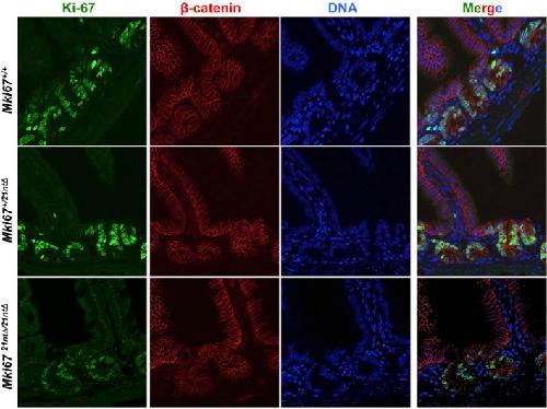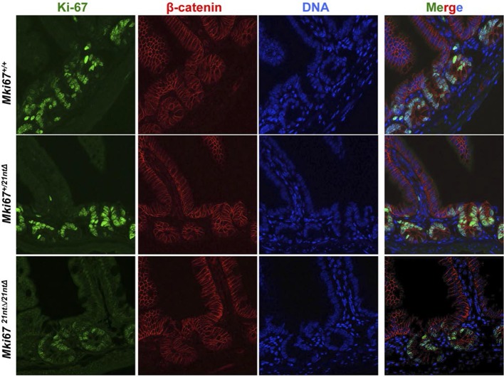 Figure 3âfigure supplement 3. Background Ki-67 levels in Ki-67 mutant mice.Immunofluorescence of Ki-67 and β-catenin on sagittal sections of the mouse intestinal epithelium from Mki67+/+, heterozygous Mki67+/21ntâand homozygous Mki6721ntâ/21ntâmice.DOI: http://dx.doi.org/10.7554/eLife.13722.009 |
