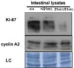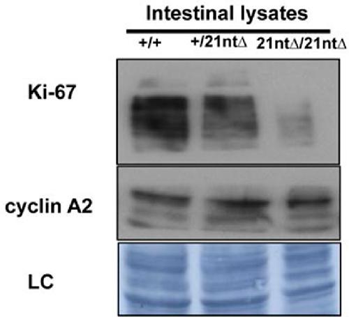 Figure 3—figure supplement 4. Background Ki-67 levels in Ki-67 mutant mice.Immunoblotting of Ki-67 and cyclin A on protein preparations of intestinal epithelium from Mki67+/+(+/+), heterozygous Mki67+/21nt∆(+/21nt∆) and homozygous Mki6721nt∆/21nt∆(21nt∆/21nt∆) mice.DOI: http://dx.doi.org/10.7554/eLife.13722.010 |