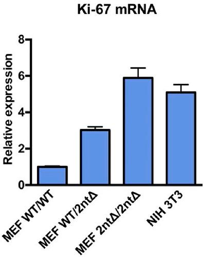 Figure 3—figure supplement 7. Ki-67 mRNA levels are not reduced in MEFs from Ki-67 mutant mice.qRT-PCR of relative Ki-67 mRNA expression, normalised to GAPDH, in MEFs isolated from Mki67+/+(WT/WT), heterozygous Mki67+/2nt∆(WT/2nt∆) and homozygous Mki672nt∆/2nt∆(2nt∆/2nt∆)mice, compared to NIH3T3 cells.DOI: http://dx.doi.org/10.7554/eLife.13722.013 |