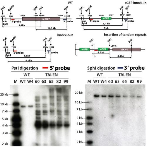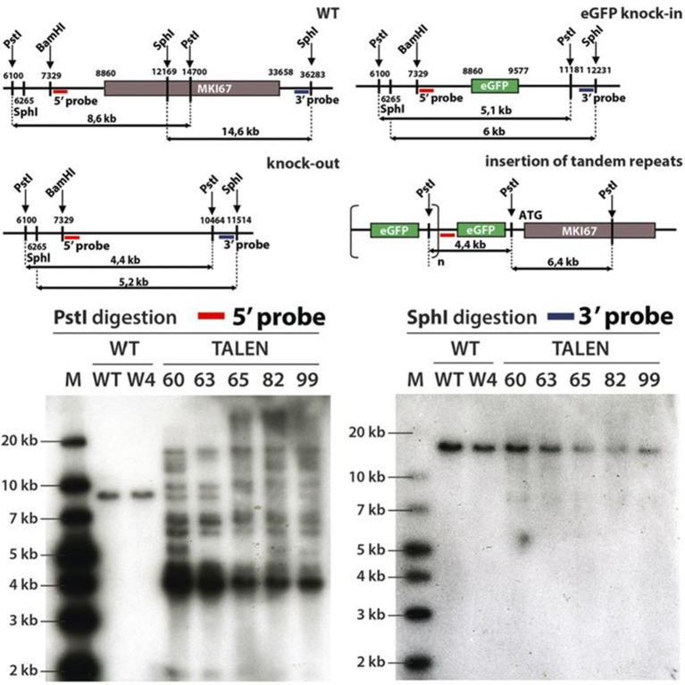 Figure 4—figure supplement 1. Generation of NIH-3T3 cells lacking Ki-67.Top, schematic representation of the wild type (WT), knock-out or eGFP knock-in Mki67 locus and the predicted insertion of tandem repeats of the eGFP insert upstream of Mki67 locus. Bottom, Southern-blot of two NIH-3T3 WT clones (WT, W4) and six NIH-3T3 Ki-67 mutant clones (60,63,65,82,99). Clones were digested with PstI or SphI and probed with 5’ or 3’ probe, respectively.DOI: http://dx.doi.org/10.7554/eLife.13722.020 |