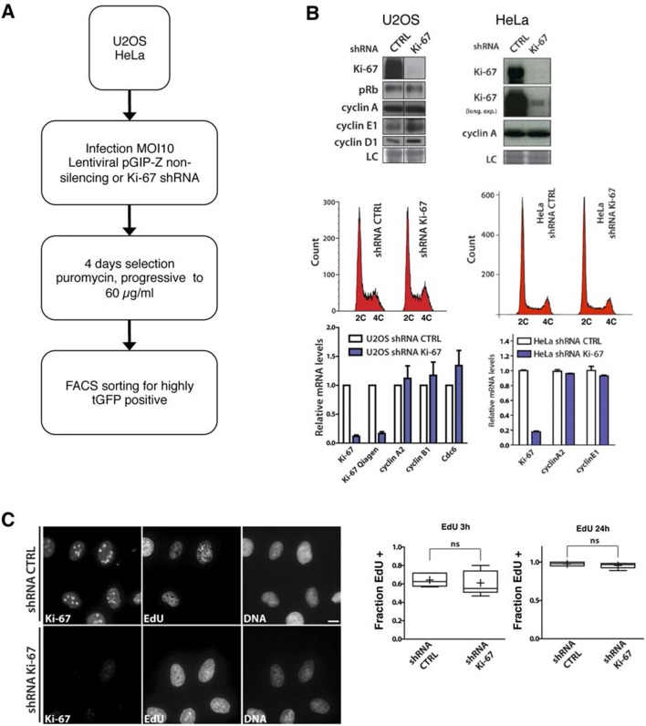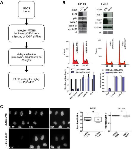 Figure 5—figure supplement 2. Cells lacking Ki-67 proliferate efficiently.(A) Schematic presentation of generation of Ki-67 shRNA knockdown cell lines. (B) Top: Western blot analysis of the indicated proteins in asynchronously growing U2OS and HeLa cells stably expressing non-targeting (CTRL) or Ki-67 shRNA. Lanes separated by lines were from a single exposure of a single SDS-PAGE gel and Western blot. LC, loading control. Middle: Cell cycle distribution of these cells. Bottom: qRT-PCR analysis of the indicated mRNA levels, normalized by mRNA expression of beta-2-microglobulin (B2m). (C) Immunofluorescence of Ki-67 and EdU in asynchronous U2OS cells stably expressing control or Ki-67 shRNA, incubated with 5-ethynyl-2’-deoxyuridine (EdU) for 3 hr. Bar, 10 µm. Right: Ratio of EdU-positive cells to the total cell number for each incubation time; ns: not significant.DOI: http://dx.doi.org/10.7554/eLife.13722.023 |