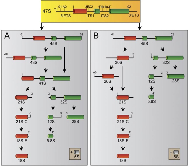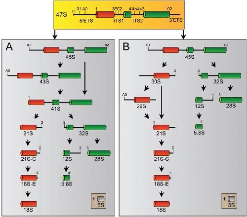 Figure 8—figure supplement 2. Human pre-rRNA processing pathway involves two major pathways.The two pathways (A and B) are characterized by specific cleavage kinetics. In pathway A, cleavages at the site A0 and 1 occur before cleavage at the site 2, whereas cleavage at site 2 occurs before cleavages at sites A0 and 1 in the pathway B. Both pathways will end by the production of the mature 28S, 18S and 5.8S. The 5S rRNA is synthesized by the RNA pol III in the nucleoplasm and will join the other rRNAs during ribosome assembly.DOI: http://dx.doi.org/10.7554/eLife.13722.036 |