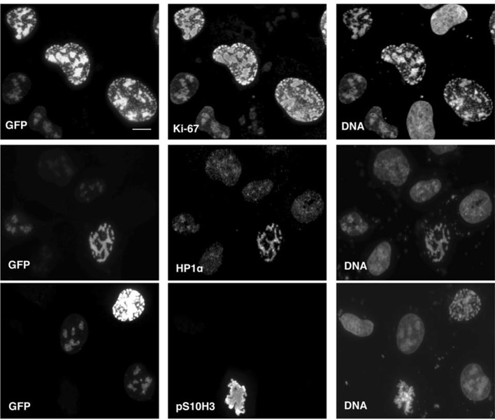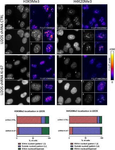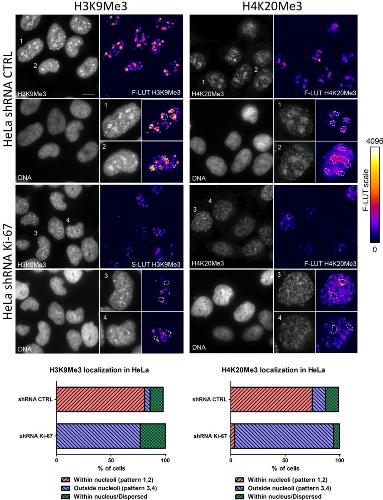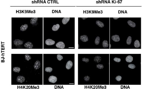 Figure 10—figure supplement 3. Heterochromatic histone mark localisation requires Ki-67.Immunofluorescence analysis of H3K9me3 and H4K20me3 localisation in stable control and Ki-67 knockdown hTERT immortalised human fibroblasts (HDF BJ hTERT) cells. Scale bars, 10 µm.DOI: http://dx.doi.org/10.7554/eLife.13722.042 |