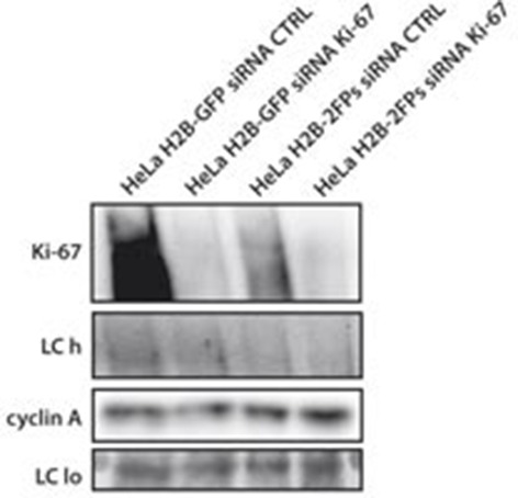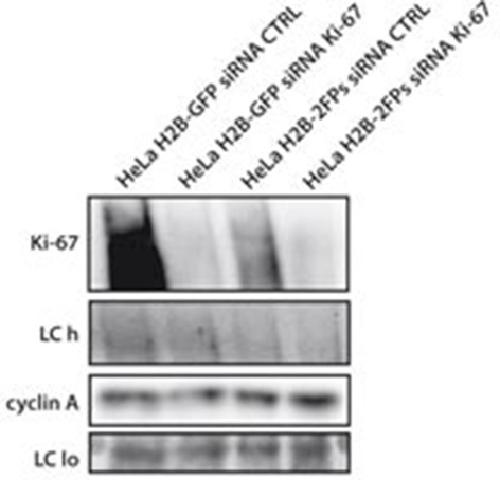 Figure 9—figure supplement 1. Knockdown of Ki-67 in H2B FRET cell line.Western blot analysis of the indicated proteins in asynchronously growing HeLa H2B FRET cells transiently transfected with control siRNA (Ctrl) or Ki-67 RNAi for 72 hr. LC, loading controls of the high (h) and low (lo) MW parts of the SDS-PAGE gel.DOI: http://dx.doi.org/10.7554/eLife.13722.038 |