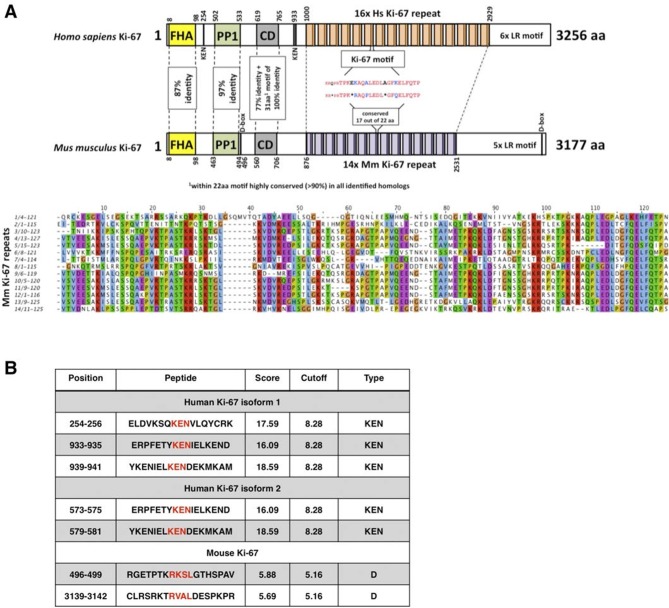 Figure 1. Comparison of human and mouse Ki-67 structural elements.(A) Top: cartoon of human (long form) and mouse Ki-67 protein highlighting conserved elements and functional motifs. Domains are indicated by boxes (FHA, forkhead-associated domain; PP1, PP1-binding domain; CD, conserved domain; D-box: APC/C targeting destruction box motifs; KEN: APC/C-Cdh1 targeting KEN box motifs). Highly conserved regions are indicated by dotted line with percent of identical amino acids. Bottom: alignment of mouse Ki-67 repeats. (B) APC/C targeting motifs identified in human (both isoforms) and mouse Ki-67.DOI: http://dx.doi.org/10.7554/eLife.13722.003 |