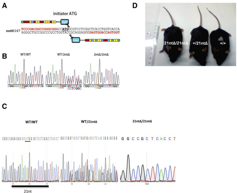 Figure 3. Mouse development with a mutated Ki-67 gene.(A) Table describing Ki-67 mutant mouse lines resulting from germline transmission of mutations generated by cytoplasmic injection of TALEN-encoding mRNA into zygotes. (B) Macroscopic appearance of littermate female mice at 10 weeks of age. Genotypes are specified. (C) IHC staining of Ki-67 in sagittal section of intestine from Mki67WT/WT, Mki67WT/2nt∆ and Mki672nt∆/2nt∆ mice. (D) Western blots of Ki-67 and cyclin A expression from intestine isolated from Mki67WT/WT, Mki67WT/2nt∆ and Mki672nt∆/2nt∆ mice. LC, loading control. (E) Western blot of Ki-67 in MEFs from WT, Mki67WT/2nt∆ and Mki672nt∆/2nt∆ mice. LC, loading control. (F) Flow cytometry profiles in WT, Mki67WT/2nt∆ and Mki672nt∆/2nt∆ MEFs showing EdU incorporation upon a 1 hr pulse and DNA content.DOI: http://dx.doi.org/10.7554/eLife.13722.006Figure 3—figure supplement 1. Ki-67 mutant mice develop normally.(A) Pair of TALE-nucleases designed to target the initiator ATG of mouse Mki67 gene. (B) Sequencing traces of initiator ATG (underlined) of Mki67 gene in WT Mki67+/+(WT/WT), heterozygous Mki67+/2nt∆(WT/2nt∆) and homozygous Mki672nt∆/2nt∆(2nt∆/2nt∆) mice. (C) Sequencing traces of initiator ATG (underlined) of Mki67 gene in WT Mki67+/+(WT/WT), heterozygous Mki67+/21nt∆(WT/21nt∆) and homozygous Mki6721nt∆/21nt∆(21nt∆/21nt∆) mice. (D) WT Mki67+/+(+/+), heterozygous Mki67+/21nt∆(+/21nt∆) and homozygous Mki6721nt∆/21nt∆(21nt∆/21nt∆) mice.DOI: http://dx.doi.org/10.7554/eLife.13722.007 |