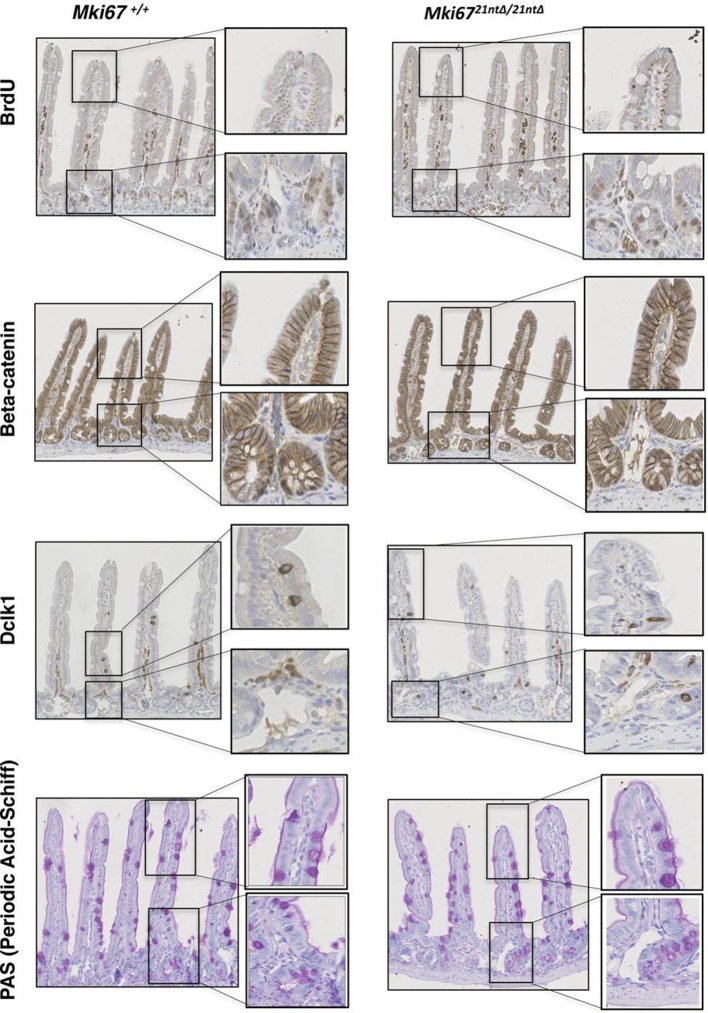 Figure 3âfigure supplement 6. Normal proliferation and differentiation in Ki-67 mutant mice.Sagittal sections of the intestine from WT Mki67+/+ and homozygous Mki6721ntâ/21ntâmice sacrificed after a 2âhr BrdU pulse, immunostained for BrdU, β-catenin, DCLK1 (a marker for tuft cells) or PAS staining of mucopolysaccharides (a marker for goblet cells).DOI: http://dx.doi.org/10.7554/eLife.13722.012 |