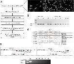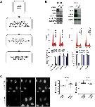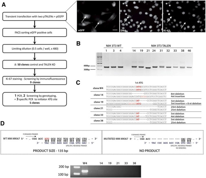 Figure 3—figure supplement 8. Generation of Ki-67-mutant NIH-3T3 cells.(A) Top and left, schematic representation of TALEN-mediated generation of NIH-3T3 biallelic Ki-67 mutant cells. Top right, immunofluorescence of Ki-67 and eGFP staining in NIH 3T3 cells transfected with two plasmids encoding TALEN pair and plasmid pEGFP. White arrows show Ki-67-negative pEGFP cotransfected cells. Scale bar 25 µm. (B) PCR analysis of Mki67 initiator ATG surrounding sequence in genomic DNA prepared from three WT clones and nine Ki-67 immunofluorescence-negative clones selected for further analysis. (C) sequencing of Mki67 initiator ATG area from selected clones (14, 19, 21, 33, 38). (D), PCR analysis targeted to the initiator ATG in Mki67 gene of genomic DNA purified from NIH 3T3 WT clone W4 and Ki-67 KO clones 14, 19, 21, 33, 38.DOI: http://dx.doi.org/10.7554/eLife.13722.014 |