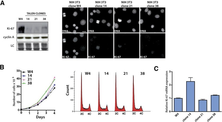 Figure 3—figure supplement 9. Ki-67-mutant NIH-3T3 cells proliferate normally.(A) Left, analysis of the indicated protein levels by Western blotting in NIH 3T3 WT clone 4 (W4) and Ki-67 mutant clones 14, 21 and 38. LC, loading control. (B) Left, growth curves of NIH 3T3 WT clone W4 and Ki-67 mutant clones 14, 21 and 38. NIH 3T3 WT and mutant cells were counted every day for 4 days. Right, cell cycle distribution of the WT clone W4 and 14, 21, 38 Ki67 mutant clones as analysed by FACS. (C) qRT-PCR analysis of Ki-67 mRNA in NIH 3T3 WT clone W4 and NIH Ki-67 mutant clones 14, 21 and 38. Normalized by mRNA expression of B2m (beta-2-microglobulin).DOI: http://dx.doi.org/10.7554/eLife.13722.015 |