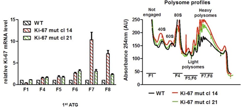 Figure 3—figure supplement 10. Basal translation of Ki-67 with a mutated ATG.Left: quantification of association of Ki-67 mRNA with ribosome fractions in biallelic single TALEN Ki-67 mutant NIH-3T3 cells by qRT-PCR, normalised to GAPDH, b2-microglobulin and actin mRNA and to WT levels. Right: RNA quantification of fractions by spectrophotometric absorbance at 254 nm.DOI: http://dx.doi.org/10.7554/eLife.13722.016 |