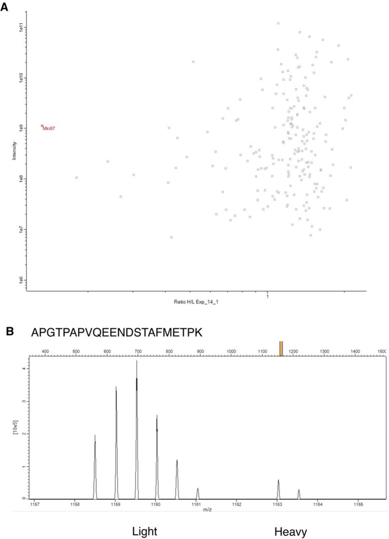 Figure 3—figure supplement 11. SILAC proteomics analysis of Ki-67 expression with a mutated ATG.(A) Scatterplot showing H/L m/z peak ratios (x-axis) against intensity levels (y-axis) from band 1 of SDS-PAGE purified chromatin, where H-labelled samples were Ki-67 mutant NIH-3T3 clone 14, L samples were W4 wild-type control. Most proteins have unaltered expression between the two cell lines (H/L ratio ≈ 1). Average H/L ratio of putative Ki-67 peptides (predicted by Maxquant on the basis of isotope profiles with the expected difference in m/z ratio from Ki-67 L-peptides positively identified by MS/MS) is shown in red. (B) Isotope profile of a light Ki-67 peptide from control cell chromatin identified by MS/MS, and the corresponding heavy peaks used for quantification. Data is provided in Figure 3—figure supplement 11—source data 1.DOI: http://dx.doi.org/10.7554/eLife.13722.01710.7554/eLife.13722.018Figure 3—figure supplement 11—source data 1. SILAC quantitation of Ki-67 peptides from WT and Mki67-mutant NIH-3T3 cells.Table showing identity and H/L ratio of Ki-67 peptides purified from chromatin of NIH-3T3 Wt, Mki67 mutant clones 14 and 21, recovered in excised bands 1 (>250 kDa) or 2 (130-250 kDa). Data have been uploaded into the massIVE repository with accession number MSV000079492.DOI: http://dx.doi.org/10.7554/eLife.13722.018 |