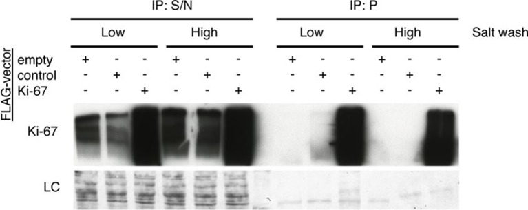 Figure 6—figure supplement 1. The Ki-67 interactome.Western blot of Ki-67 in nuclear extracts from cells expressing FLAG-tagged versions of Ki-67 or a control unrelated protein, or FLAG alone. IP: immunoprecipitation; S/N: supernatant; P: pellet. Bottom, loading control.DOI: http://dx.doi.org/10.7554/eLife.13722.026 |