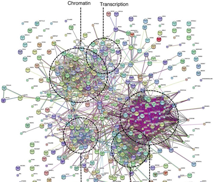 Figure 6. Ki-67 interacts with proteins involved in nucleolar processes and chromatin.Simplified STRING analysis reveals network interactions between proteins associating with Ki-67. The full network is shown in Figure 6—figure supplement 2; data is provided in Figure 6—source data 1.DOI: http://dx.doi.org/10.7554/eLife.13722.02410.7554/eLife.13722.025Figure 6—source data 1. Ki-67 interacting proteome.Table showing proteins identified by mass spectrometry eluted from immunoprecipitates of cells transfected with FLAG-tagged Ki-67, an unrelated protein (FLAG-tagged TRIM39) or empty vector. Proteins specifically interacting only with Ki-67 are presented on the first worksheet. Data are available via ProteomeXchange with identifier PXD003551.DOI: http://dx.doi.org/10.7554/eLife.13722.025Figure 6—figure supplement 1. The Ki-67 interactome.Western blot of Ki-67 in nuclear extracts from cells expressing FLAG-tagged versions of Ki-67 or a control unrelated protein, or FLAG alone. IP: immunoprecipitation; S/N: supernatant; P: pellet. Bottom, loading control.DOI: http://dx.doi.org/10.7554/eLife.13722.026 |