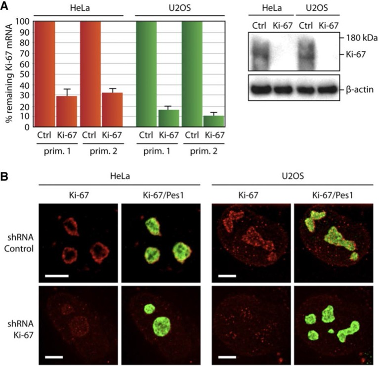 Figure 7—figure supplement 3. Depletion of Ki-67 does not affect overall nucleolar structure.(A) Histograms showing the level of Ki-67 mRNA remaining in the cell lines expressing constitutively the shRNA against Ki-67. These levels were assessed by RT-qPCR using two different pairs of primers. Right, the Western-blot against Ki-67 shows a disappearance of a bands in the cell lines constitutively expressing the shRNA against Ki-67. (B) Immuno-fluorescence against Ki-67 in control HeLa and U20S cell lines in the absence (control) or in the presence (Ki-67) of the shRNA targeting Ki-67 mRNA. The PES1 signal shows that the nucleolar structure is maintained. Objective 100 x. Scale bar: 5 μm.DOI: http://dx.doi.org/10.7554/eLife.13722.031 |