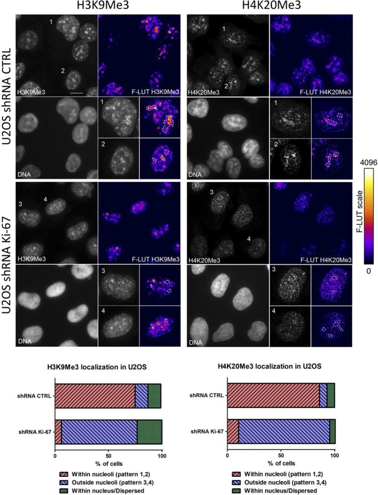 Figure 10—figure supplement 1. Heterochromatic histone mark localisation requires Ki-67.Immunofluorescence analysis of H3K9me3 (left) and H4K20me3 (right) localisation in stable control and Ki-67 knockdown U2OS cells. Right: Fire look up table (F-LUT) pseudocolouring of immunofluorescence staining intensity, generated using Fiji software (Schindelin et al., 2012). Dotted white lines denote nucleolus, while numbers 1–4 identify cells for insets as well as staining patterns within nucleolus (1,2) or outside the nucleolus (3,4). Histograms below show the percentage of cells counted showing each pattern. The 2D Fire-LUT surface plot was generated using Fiji software(1). Scale bar: 10 μm.DOI: http://dx.doi.org/10.7554/eLife.13722.040 |
