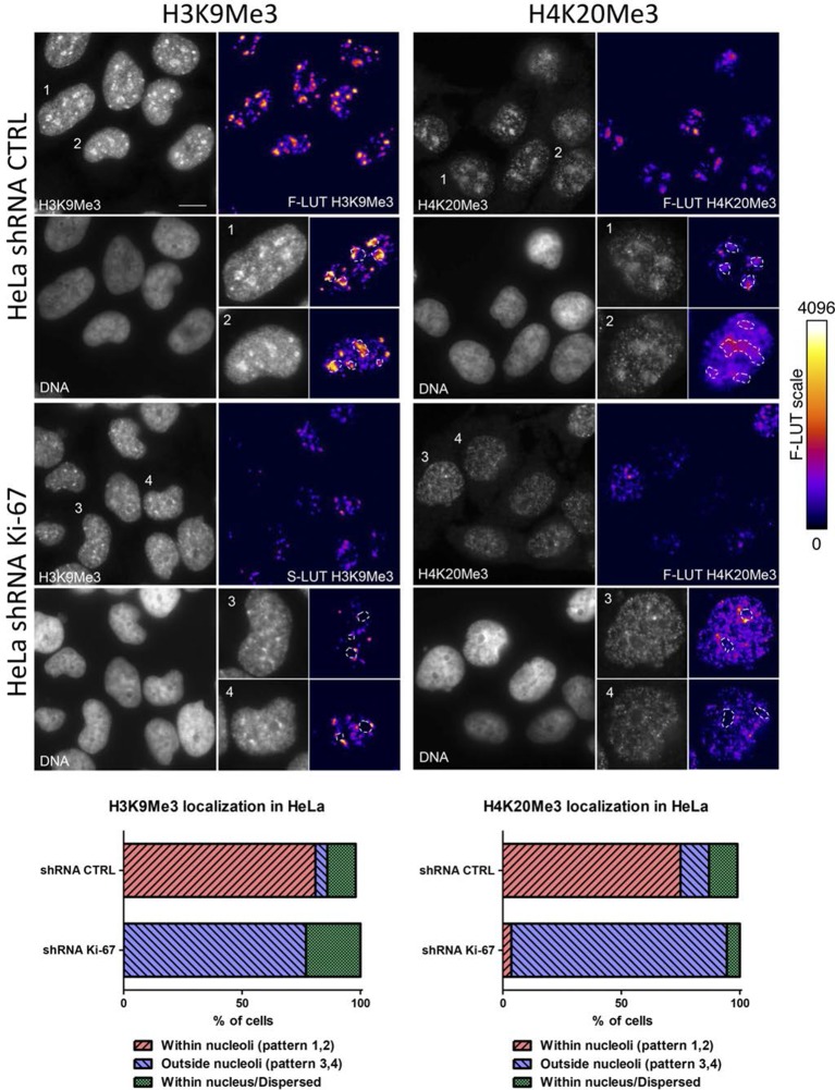 Figure 10—figure supplement 2. Heterochromatic histone mark localisation requires Ki-67.Immunofluorescence analysis of H3K9me3 (left) and H4K20me3 (right) localisation in stable control and Ki-67 knockdown HeLa cells. Right: Fire look up table (F-LUT) pseudocolouring of immunofluorescence staining intensity. Dotted white lines denote nucleolus, while numbers 1–4 identify cells for insets as well as staining patterns within nucleolus (1,2) or outside the nucleolus (3,4). Histograms below show the percentage of cells counted showing each pattern. Scale bar: 10 μm.DOI: http://dx.doi.org/10.7554/eLife.13722.041 |