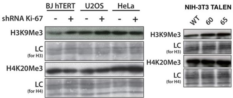 Figure 10—figure supplement 4. Overall heterochromatic histone mark levels do not change upon Ki-67 knockdown.Left: western blot of total H3K9me3 and H4K20me3 level in control and stable Ki-67 knockdown BJ-hTERT, U2OS and HeLa cells. LC, loading control. Right: western blot of total H3K9me3 and H4K20me3 level in NIH-3T3 WT clone W4 and Ki-67-negative TALEN clones 60, 65. LC, loading controlDOI: http://dx.doi.org/10.7554/eLife.13722.043 |