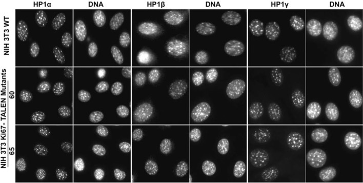 Figure 10—figure supplement 5. HP1 localises normally to chromocentres in Ki-67 mutant cells.Immunofluorescence analysis of localisation of HP1α, HP1β and HP1γ in WT and Ki-67-negative NIH-3T3 mutant clones 60 and 65, as compared with DAPI staining.DOI: http://dx.doi.org/10.7554/eLife.13722.044 |
