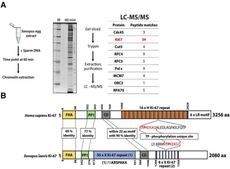 Figure 11—figure supplement 2. A Xenopus Ki-67 homologue (A) Chromatin proteomics in replicating Xenopus egg extracts.Scheme of the experiment and electrophoresis separation of sample processed and analysed by mass spectrometry. Table shows peptide matches. M, molecular weight marker. (B) Schematic comparison of Xenopus Ki-67 homologue with human Ki-67 (long form). Domains are indicated by boxes (FHA, forkhead-associated domain; PP1, PP1-binding domain; CD, conserved domain). Highly conserved regions are indicated by dotted line with percentage of identical amino acids. TP, threonine-proline phosphorylation site.DOI: http://dx.doi.org/10.7554/eLife.13722.047 |