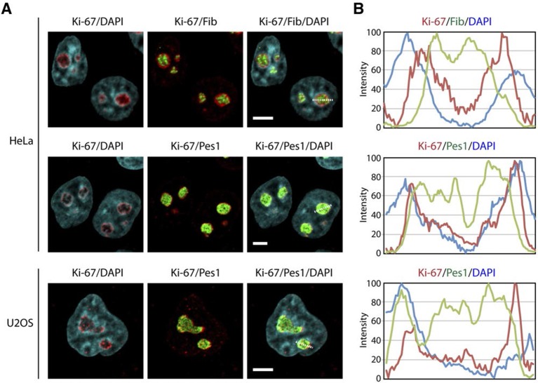 Figure 7. Ki-67 localises PES1 to mitotic chromosomes.(A) Analysis of the interphase localisation of PES1 and Ki-67 proteins by immunofluorescence in HeLa cells 72 hr after transfection with control siRNA (scramble; Scr) or Ki-67 RNAi. Right, line scans showing the distribution of fluorescence signals within indicated nucleoli (dashed line). Images were captured in confocal mode with a spinning-disk microscope. Bar, 5 μm. (B) Analysis of the mitotic localisation of PES1 and Ki-67 proteins by immunofluorescence in HeLa cells 72 hr after transfection with control siRNA (scramble; Scr) or Ki-67 RNAi. Bar, 5 μm.DOI: http://dx.doi.org/10.7554/eLife.13722.028Figure 7—figure supplement 1. Ki-67 is a nucleolar protein localizing in the cortical side of the GC.(A) Localisation of Ki-67 protein by immunofluorescence in HeLa and U2OS cells. Fibrillarin (DFC) or Pes1 (GC) were used as nucleolar markers. Images were captured in confocal mode with a spinning-disk microscope. Objective 100 x. Scale bar: 5 μm. (B) Line scans showing the distribution of fluorescence signals within specific nucleoli (see dotted lines in panel A).DOI: http://dx.doi.org/10.7554/eLife.13722.029 |