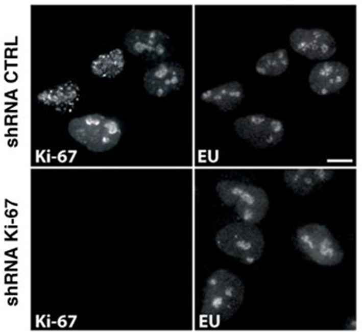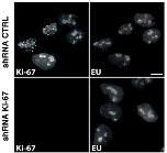 Figure 8—figure supplement 1. Ki-67 depletion does not hinder rRNA transcription.Newly synthesised RNA in asynchronous U2OS cells expressing control or Ki-67 shRNA visualised by 5-ethynyl uridine (EU) incorporation and immunofluorescence. Bar, 10 µm.DOI: http://dx.doi.org/10.7554/eLife.13722.035 |