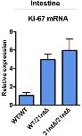 Figure 3—figure supplement 5. Ki-67 mRNA levels are not reduced in Ki-67 mutant mice.qRT-PCR of relative Ki-67 mRNA expression, normalised to GAPDH, on preparations of intestinal epithelium from Mki67+/+(WT/WT), heterozygous Mki67+/21nt∆(WT/21nt∆) and homozygous Mki6721nt∆/21nt∆(21nt∆/21nt∆)mice.DOI: http://dx.doi.org/10.7554/eLife.13722.011 |