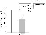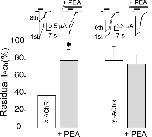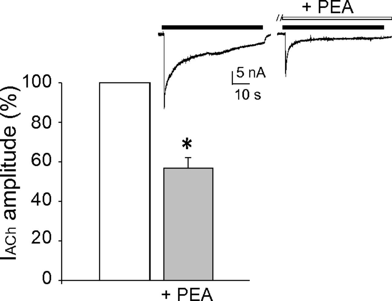 Fig. 1. PEA affects ACh currents in oocytes injected with ALS muscle membranes. Bar graphs show the percentage of ACh amplitude remaining before and after 10 μM PEA treatment (10 min, 50 oocytes), as indicated. (Inset) Sample current traces elicited during prolonged ACh application (500 μM for 60 s) in one oocyte (representative of 10) injected with ALS muscle membranes before and after PEA treatment. In this and subsequent figures, horizontal filled bars indicate the timing of ACh applications, and horizontal open bars indicate the drug applications. *P < 0.05. Holding potential, −60 mV.