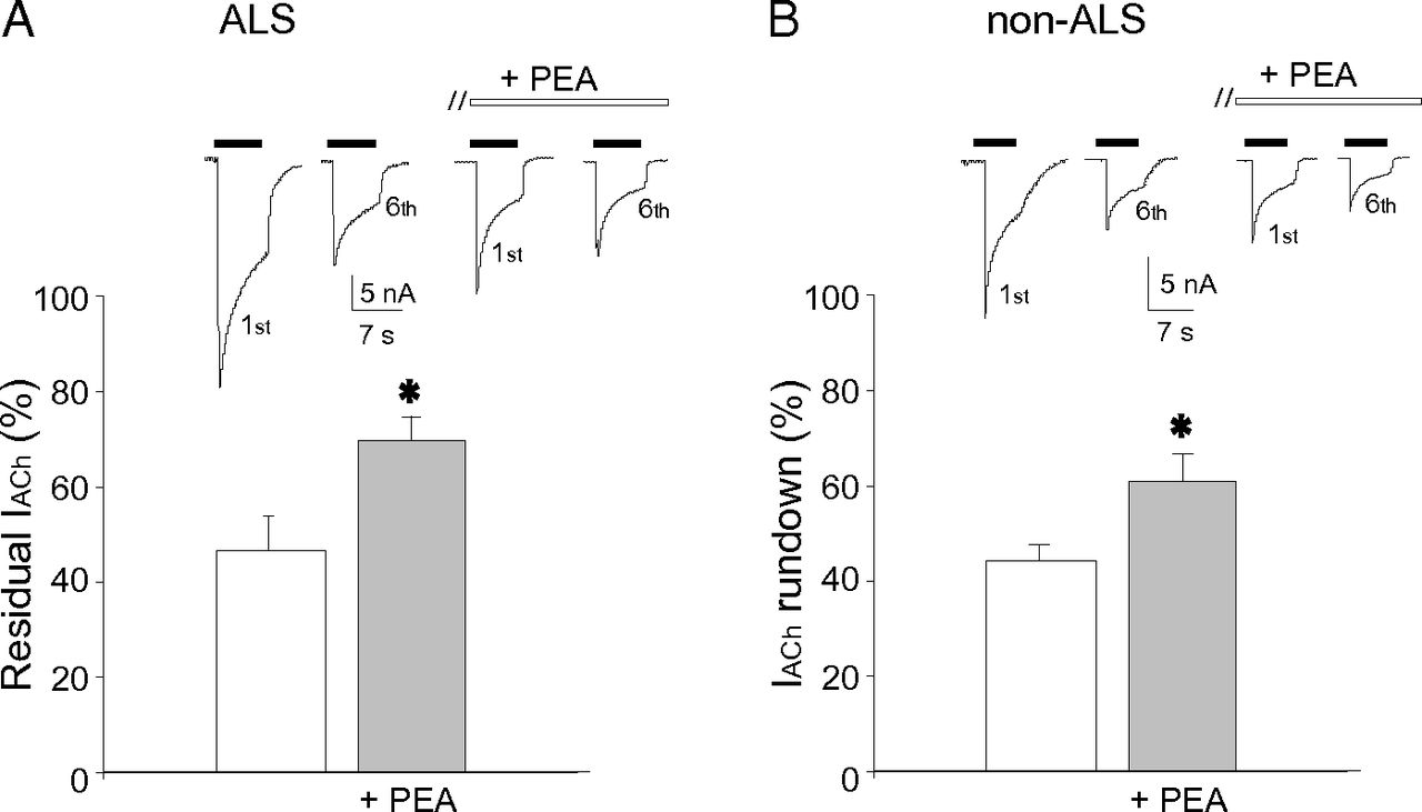 Fig 2. Effect of PEA on IACh rundown. (A) Bar graphs of residual IACh (i.e., the ratio between sixth and first IACh amplitude) before and after treatment with 10 µM PEA (10 min) in oocytes injected with ALS muscle membranes. (Inset) Representative currents elicited by the first and sixth ACh application (500 µM; horizontal filled bar) in one oocyte injected with ALS muscle membranes before and after PEA (open bar), as indicated. (B) Bar graphs represent IACh remaining in oocytes injected with non-ALS denervated muscle membranes before and after PEA, as in A. (Inset) Representative currents elicited in one oocyte injected with non-ALS denervated muscle membranes, as in A. Data are the means ± SEM of 40 oocytes (ALS patients #1–4,14, 20, and 39–42) (Table S1) and 35 oocytes (non-ALS patients #79, 80, 82–84, and 90–93) (Table S1). *P < 0.05. Holding potential, −60 mV.