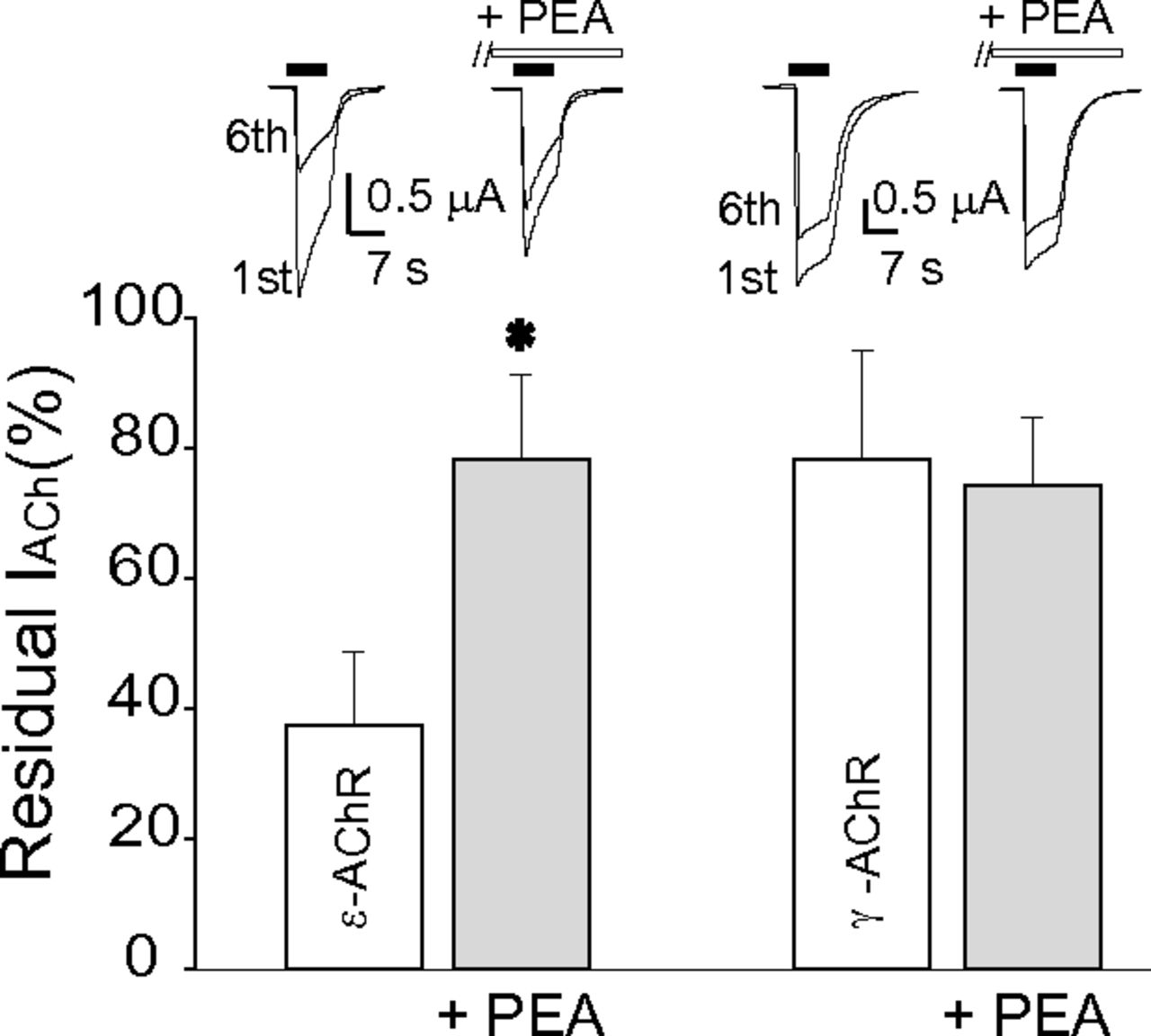 Fig 3. Effect of PEA on oocytes expressing ε-AChRs or γ-AChRs. Bar graphs of residual IACh (i.e., the ratio between sixth and first IACh amplitude) before and after 10 µM PEA treatment (10 min) in oocytes expressing ε-AChRs (Left) or γ-AChRs (Right), as indicated. (Inset) Representative superimposed currents elicited by the first and sixth ACh application (500 µM; horizontal filled bar) in oocytes expressing ε-AChRs or γ-AChRs before and after PEA (open bar), as indicated. *P < 0.05. Holding potential, −60 mV.