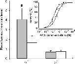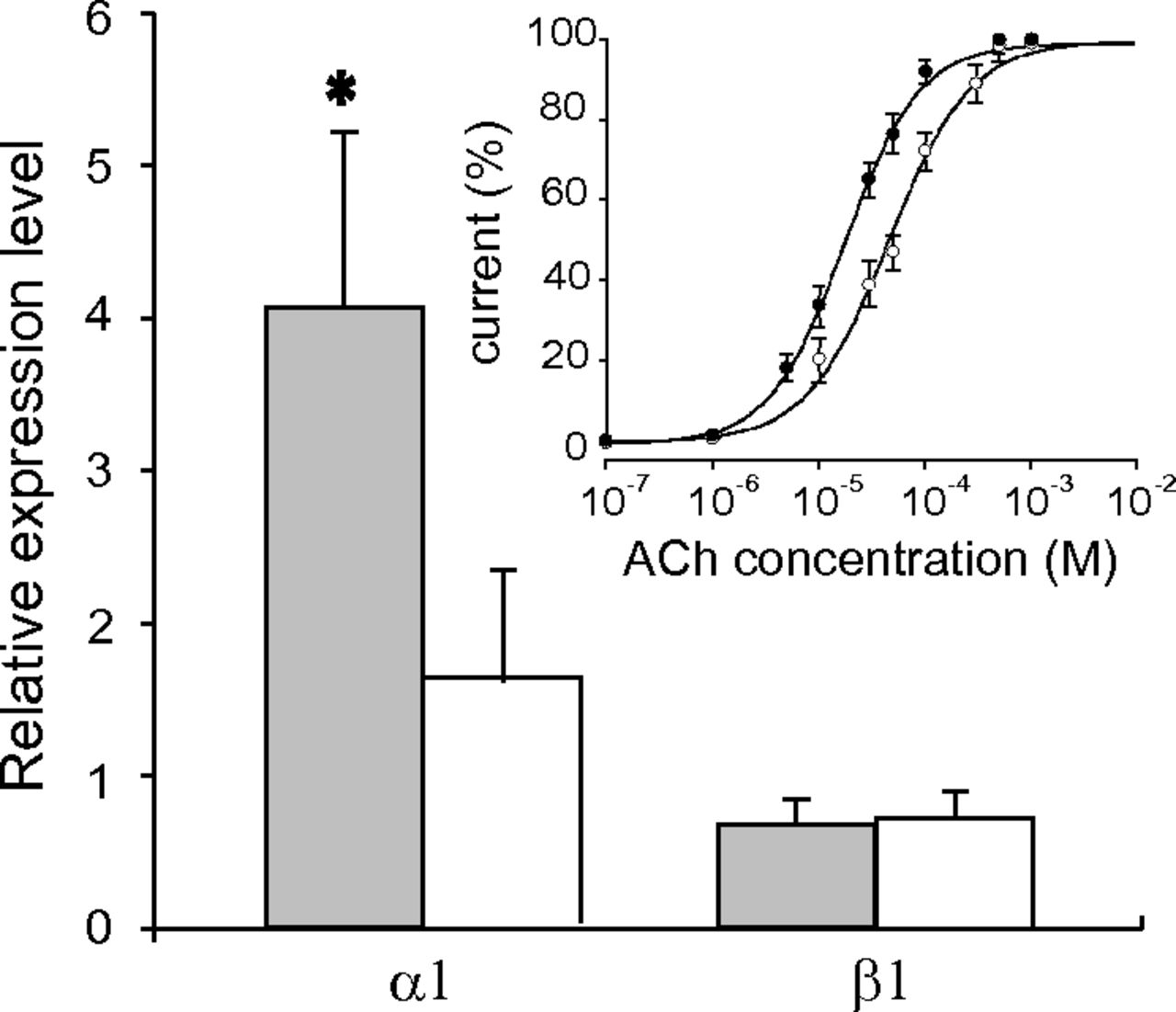 Fig 4. The α1 AChR subunit is increased in ALS patients. A statistically significant difference (P = 0.0058) was found in the relative expression level of the α1 ACh subunit in ALS (gray bars) compared with non-ALS (white bars) patients (twelve for each group; Table S1). In contrast, no significant change was found in the expression of the β1 subunit. (Inset) Amplitude of currents evoked by various ACh concentrations, expressed as a percentage of the maximal current evoked by 1 mM ACh, plotted as mean ± SEM and best fitted with Hill curves. Averaged EC50 values and nH in oocytes injected with α1β1εδ cDNAs (1:1:1:1 ratio) were 18.4 ± 3.8 μM and 1.2 ± 0.01 (●); in oocytes injected with α1β1εδ cDNA (5:1:1:1 ratio), the values were 56 ± 7 μM and 1 ± 0.01 (○).