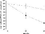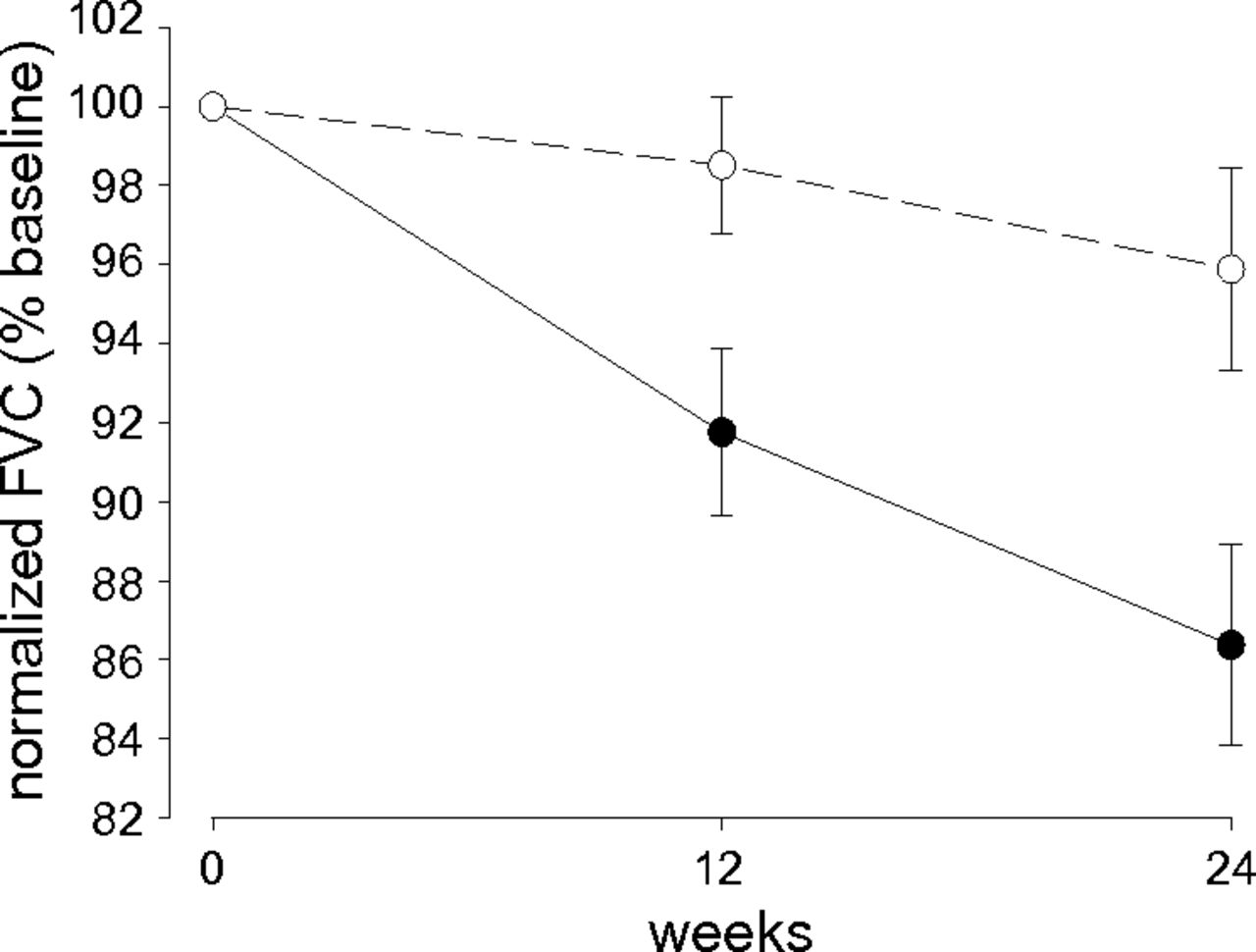 Fig 5. Effects of PEA treatment on pulmonary function in ALS patients. Predicted FVC% of untreated (●, Table S2) and PEA–treated (○, Table S2) patients at baseline (0) and after 12 and 24 wk of treatment. Data are normalized to the baseline value in each patient; values are expressed as mean ± SEM. The decrease in FVC% was higher in untreated patients than in PEA-treated patients (repeated measures ANOVA, F = 4.46, P = 0.0154 for time × treatment effect), indicating that the disease progressed more slowly during the 24-wk follow-up in patients receiving PEA.