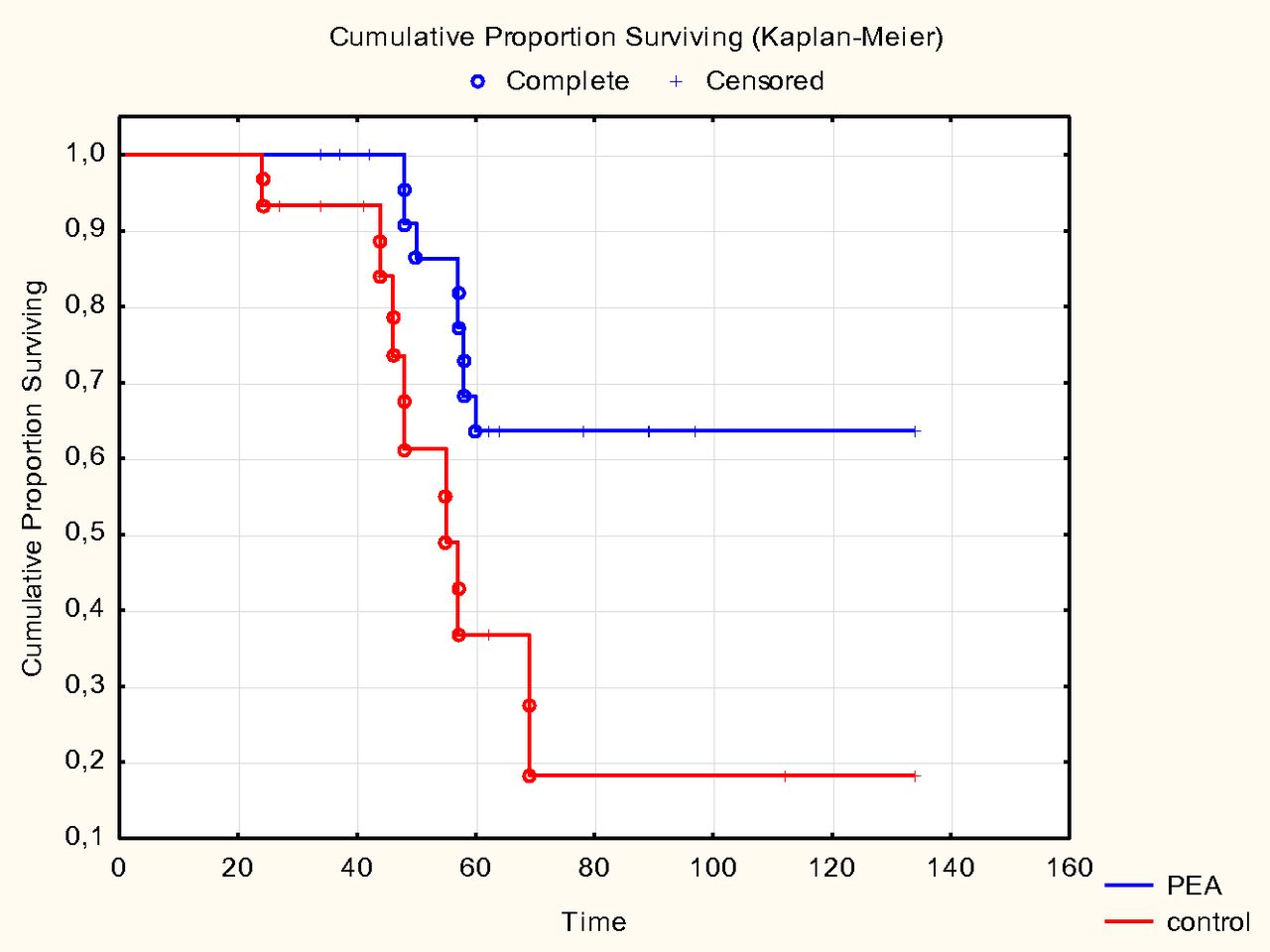 Fig. S1. Effects of PEA treatment on tracheotomy and death. Cumulative proportion surviving related to tracheotomy and death in untreated (red trace, 36 patients) and PEA-treated (blue trace, 28 patients) patients in the 6-mo follow-up period after 6 mo of PEA treatment. The cumulative proportion surviving is the proportion of ALS patients who survived without tracheotomy (days). Note that death and tracheotomy occurred more frequently in untreated than in PEA-treated patients (P = 0.05).