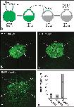 Figure 3. Diffusion of EGFP-Noggin1/2/4 from the ectodermal grafts.(a) Experimental design. The region that corresponds to images (bâd) is framed by a dashed rectangle. (bâd) Representative examples of the grafts 1 hour after transplantation. Note that in contrast to recipient embryo cells, graft cells contain EGFP-Noggin1/2/4 in the cytoplasm. To compare the diffusibility of the EGFP-Noggin1/24, the diffusion path (DP) was measured for each graft in six directions (white lines radiated under 60 degrees from the approximate centre of the graft), beginning from the graft border until the point at which the EGFP fluorescence level in an IS became equal to the background fluorescence level in the donor IS (pairs of white bars perpendicular to the radial lies). (e) Medium DP and deviation calculated for all grafts per type (number of grafts is indicated within each column). |