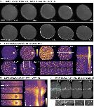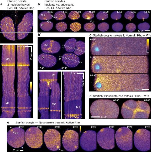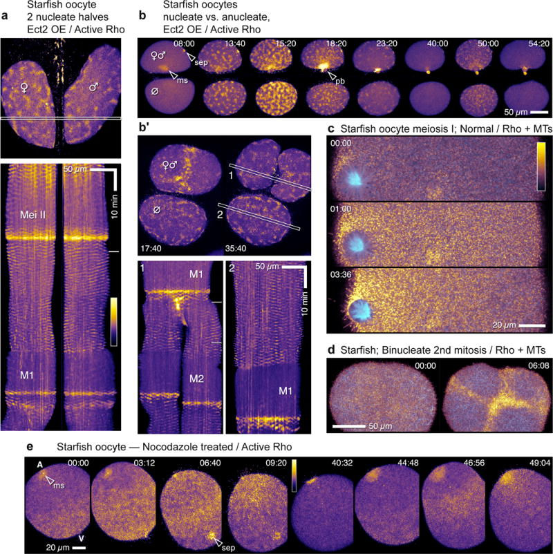 Figure 7. Excitability does not require spindles but is locally modulated by microtubules (a) Still frame (top) and kymograph (bottom) from time-lapse movie showing cortical Rho activity in two nucleate fragments derived from bisection of Ect2-overexpressing starfish oocyte. Waves of Rho activity appear and disappear in synchrony in each half. Pseudocolor table shown applies to a,b,b′, and e; in a and b′, outlined strips indicate kymograph region, dashes in kymographs are times of still frames. (b) Frames from time-lapse movie showing cortical Rho activity in nucleate half (top) and anucleate cytoplast (bottom) after bisection of Ect2-overexpressing starfish oocyte just before meiosis I. Waves appear and disappear on time in anucleate cytoplast in spite of the fact that it lacks spindle, chromosomes, or even centrosomes (see Supplementary Video 17) (b′) Similar bisection but after meiosis; two frames (top), during and after first cleavage, and kymographs (bottom, 1: nucleated, 2: anucleate). Cortical Rho waves appear and disappear in both halves, although first mitosis is delayed in the anucleate cytoplast. (c) Frames from time lapse movie showing microtubules (cyan) and active Rho (gold) in normal starfish oocyte during meiosis I. Rho activity is suppressed in the region occupied by spindle aster. (d) Frames from time lapse movie showing microtubules (cyan) and active Rho (gold) in starfish zygote with two spindles. Rho activity waves are excluded from regions occupied by spindle asters leading to focusing of Rho waves into cruciform Rho zone. (e) Meiotic Rho activity in normal starfish oocyte after treatment with 5 uM nocodazole to depolymerize microtubules (see Supplementary Video 18). The overall pattern of Rho activation is similar to controls – initiation at vegetal end, rapid progression to animal pole, inactivation in M-phase – except that animal pole is a Rho hotspot instead of a suppressed area; sep=sperm entry point, ms=meiotic spindle. Images are representative of 3(a, b), 12(c),17 (d) and 3(e) independent experiments, respectively.