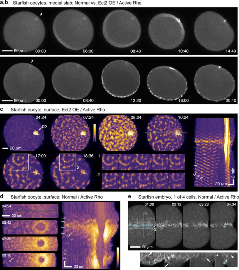 Figure 3. Rho activity waves in starfish oocytes and embryos. (a,b) Frames from time-lapse sequences of Rho activity during meiosis I in normal starfish oocyte (top; projection of 8 1 micron sections) and oocyte overexpressing wild-type S. purpuratus Ect2 (bottom; projection of 8 1.5 micron sections). See Supplementary Video 6. Arrow indicates animal pole. Rho activity appears at vegetal pole, spreads upward, and converges on nascent polar body, forming cytokinetic Rho zone. In Ect2-expressing oocytes the global pattern of Rho activity mirrors that of controls but waves are much brighter, travel further, and persist after polar body emission. (c) Surface view of cortical Rho activity in meiosis II oocyte overexpressing Ect2 (see Supplementary Video 7; pb = polar body; projection of 14 1 micron sections). High amplitude waves form and settle into repetitive, often spiral, patterns. Inset montages are successive 60 s time points from boxed region on left starting at 17:00 (1) or 18:36 (2), showing patterns that approximately replicate on ~ 70 sec time scale (1 is spiral, 2 is center-surround with a slash underneath). Kymograph on right generated from area indicated by outlined strip, 4th frame. Diagonal bands span half the oocyte, showing that waves travel at least this far. Horizontal lines in kymograph mark times of frames shown on left. Arrowheads point to wave front that traverses tens of microns at steady speed (d). Surface view of cortical Rho activity in normal starfish oocyte, single frames (left) and kymograph (right). Rho waves appear, brighten, and coalesce into continuous zone around nascent polar body (see Supplementary Video 8). Arrowheads indicate wavelet that appears in both kymograph and still frame. (e) Rho activity in normal starfish blastomere (1 of 4 cells), still frames and kymographs generated from strips outlined in blue: 1, furrow center; 2, furrow periphery; 3, just outside furrow; 4, across furrow. Rho waves focus at equator before ingression, appear in the furrow (arrows), and eventually merge into a coherent Rho zone. Asterisk indicates particularly bright focus that appears in 4th still frame and kymographs 1 and 4. Images are representative of 10 (a, d), 20 (b, c) and 4 (e) independent experiments, respectively.