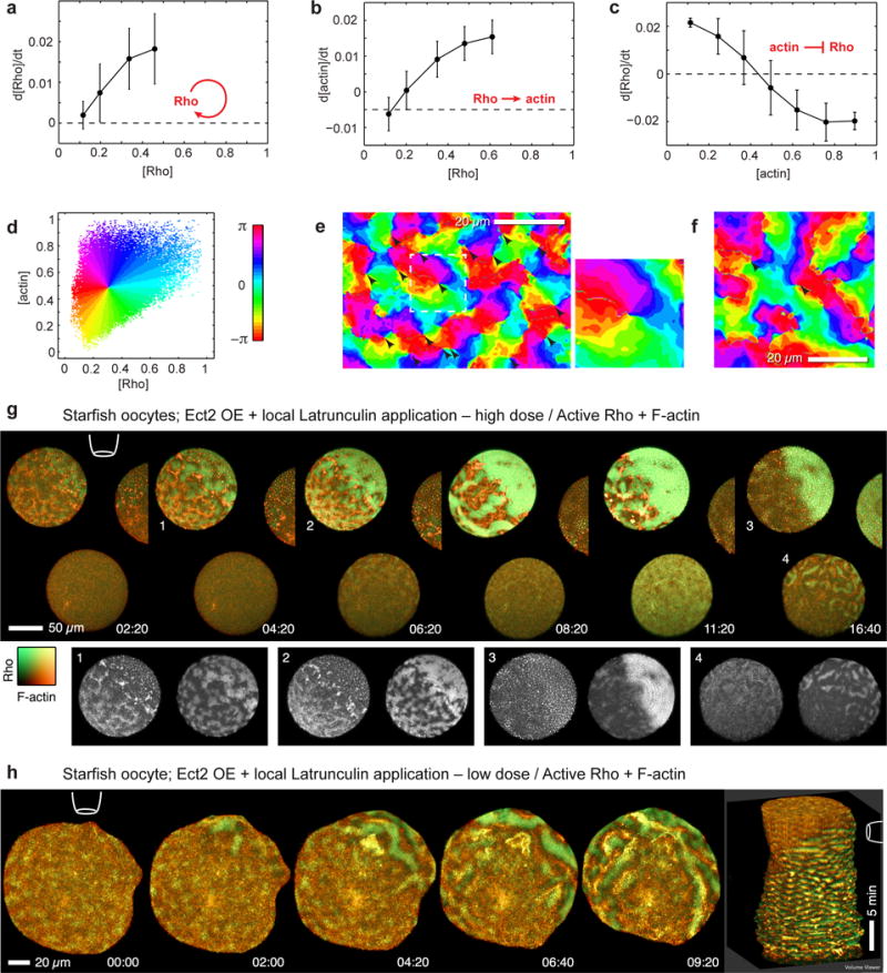 Figure 5. Analysis of Rho and F-actin dynamics reveals cortical excitability and spiral turbulence. (a) Rho activation rate (mean ± SD) increases with Rho activity signal indicating that Rho activates itself in a positive feedback loop. Correlation assessed from pixels with low F-actin signal (see Supplementary Figures 4a). (b) F-actin accumulation rate is positively correlated with Rho activity (assessed from pixels with low F-actin signal). (c) Rho activation rate is inversely correlated with F-actin signal, to the point of switching to inactivation at high F-actin density (assessed from pixels with high Rho activity signal). Results are mean ± SD; n=900 cycles. (d) Each cortical locus (image pixel) can be mapped by its particular values of Rho activity and F-actin density to a single phase value, an angle between 0 and 2π, shown in rainbow colors: Cortical loci at the front of waves appear green, loci at Rho wave crests as cyan, at F-actin wave crests as dark blue-magenta, and loci at the back of the wave are red and orange. (e) Phase reconstruction for starfish oocyte overexpressing Ect2 (Supplementary Video 13). Points where all rainbow colors (phase values) merge indicate spiral cores (arrowheads). Inset: magnification of spiral wave core neighborhood outlined by dashed line. (f) Phase reconstruction for activated frog egg overexpressing Ect2. (g) Meiotic Ect2-overexpressing starfish zygotes containing GFP-rGBD (Rho activity; malachite) and mCherry-Utr (F-actin; copper), time-lapse sequence after application of high concentration of LatB (10 uM) from agarose-filled pipette (position indicated by cartoon); treatment causes rapid cortical F-actin collapse and corresponding burst of Rho activation (see Supplementary Video 14). Insets: single channel images of cells/stages indicated by numerals: 1) initial response, 2) wave regime on far side, collapse on near side, 3) total collapse, 4) wave regime on near side of distant oocyte (h) Similar to (g), but low-dose (1 uM) LatB induces shift from typical Ect2-enhanced wave regime to higher-amplitude, longer-period wave regime, in which large scale Rho waves propagate away from site of local F-actin disassembly (see Supplementary Video 15); rightmost image is kymocube rendered using ImageJ. Images are representative of 5 independent experiments.