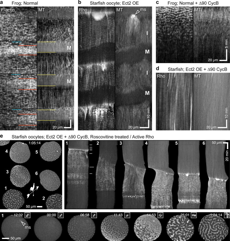 Figure 6. Cdk1 gates excitability. (a) Kymograph from normal frog embryo showing waves of cortical F-actin (left) and cortical microtubules (right). I=Interphase; M=M-phase; Yellow lines on right indicate M-phase onset, as revealed by loss of cortical microtubules. Actin waves persist throughout M-phase but wave density varies: at M-phase onset (blue line on left), waves are spaced farther apart; this is followed by period of same length as M-phase but slightly delayed in which F-actin waves are brighter (red lines). (b) Kymograph from double-labeled starfish oocyte overexpressing Ect2 showing waves of cortical Rho activity (left) and cortical microtubules (right). Rho waves cease in each M-phase and reappear in each interphase. ms = meiotic spindle. (c) Kymograph of frog blastomere expressing Δ90 cyclin B showing cortical F-actin (left) and cortical microtubules (right). As time of high Cdk1 activity lengthens (revealed by loss of cortical microtubules) cortical F-actin waves progressively disappear. (d) Kymograph of Ect2-overexpressing starfish oocyte expressing Δ90 cyclin B as well, showing cortical Rho activity (left) and cortical microtubules (right). Rho waves fail to appear as cell remains arrested with high Cdk1 activity. (e) Top left: Rho activity in starfish oocytes overexpressing Ect2 and expressing Δ90 Cyclin B, 65 min after treatment with 40 μM roscovitine to inhibit Cdk1 (see Supplementary Video 16). Weather vane indicates direction of roscovitine flow. Roscovitine-containing seawater perfused around tight-packed oocytes from Southeast to Northwest at time 00:00; cells 1 and 2 are at cluster edge, cells 5 and 6 are in cluster center; hence, weathervane indicates presumed gradient of drug exposure. All oocytes show robust Rho waves at this time point. Top Right: kymographs of oocytes (identified by numerals) showing development of cortical Rho activity waves following Roscovitine treatment. Note that onset of waving follows expected rate of Cdk1 inhibition based on access to drug in perfused media. Bottom: successive frames showing oocyte 1 alone; inset shows chromosomes, arrowhead indicates position of meiotic spindle. Rho waves are well developed at least five minutes before anaphase begins. Images are representative of 4(a), 3(b), 5(c) and 6(d) independent experiments, respectively.