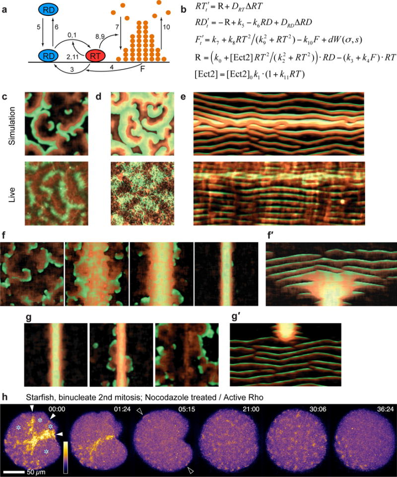 Figure 8. Model of excitable dynamics predicts that Ect2 spatio-temporal distribution determines the pattern of Rho-actin cortical activity. (a) Schematic diagram of the molecular processes described by the model (see Methods). Numbers on the arrows correspond to numbers of rate constants in b. (b) Model equations (see Supplementary Figure 6a and Methods). (c) Top: Simulation of wave turbulence with Ect2 level representing interphase wave pattern in starfish oocytes with extra Ect2 (see Supplementary Video 19), active Rho (malachite) and F-actin (copper). Bottom: image of cortical Rho (malachite) and F-actin (copper) from Ect2-overexpressing starfish oocyte for comparison. (d) Top: Model dynamics at the peak of global Ect2 activity – representing polar body emission phase – demonstrates a characteristic wave pattern with broad crests, substantial overlap of Rho and F-actin maxima and narrow refractory zones between wave crests (see also Supplementary Figures. 6b,c and Methods). Bottom: image of cortical Rho (malachite) and F-actin (copper) from Ect2-overexpressing oocyte at time of polar body emission for comparison. (e) Top: Model kymograph of Rho activity and F-actin prior to, during, and after polar body emission (see Supplementary Video 19). Bottom: experimental kymograph for comparison. (f) Emergence of furrow through condensation of waves in a simulation representing mitotic starfish cells with progressive focusing of Ect2 at the cell equator (see Supplementary Video 20). (f′) Kymograph along a line perpendicular to the furrow for model behavior in f. (g) Simulation of rapid microtubule depolymerization after furrow zone formation: furrow signal dissipates and spatially-homogeneous waves return. (g′) Kymograph of simulation shown in f. (h) Behavior of cortical Rho waves following experimental microtubule depolymerization by nocodazole in binucleate starfish zygote at the onset of cytokinesis. Cytokinetic Rho zones dissipate quickly and waves repopulate the entire cortex. Asterisks indicate spindle pole positions; solid arrowheads indicate Rho zones in nascent furrows; hollow arrowheads point out instances of cortical Rho waves in once-bare territory (see Supplementary Video 21). Images in h are representative of 3 independent experiments.