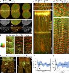 Figure 4. F-actin assembly fronts directly follow, but overlap minimally with, Rho activity waves. Color table shown in (b) applies to all images in this figure. (a) Normal starfish blastomere co-expressing GFP-rGBD (malachite; Rho activity) and GFP-Utr (copper; F-actin), selected frames (top) from time-lapse sequence of cytokinesis (Supplementary Video 9), and raw and subtracted kymographs (bottom) made from outlined strip. In still images, cytokinetic furrow is populated by apparently random densities of active Rho and F-actin; kymographs show these correspond to wavelets in which Rho activity rises, then falls as actin assembles. (b) Still images (left) and kymographs (right) from time-lapse movie of cortical F-actin and Rho activity in frog embryo showing two cells (1, 2) undergoing cytokinesis. Rho waves in furrow are followed by F-actin assembly waves. (c) Rho activity and F-actin in a starfish oocyte modestly overexpressing wild-type Ect2; kymograph (bottom) made from strip outlined in still frame (top). See Supplementary Video 10. Except during the global burst of Rho activity accompanying each meiotic cytokinesis, Rho activity waves immediately precede F-actin assembly, and F-actin disassembly precedes each Rho activation wave. Inset magnifies 4 cycles from wave train after first meiosis, emphasizing minimal overlap (yellow) between malachite and copper, and dark zone separating copper from next malachite wave. (d) Activated frog egg subjected to Ect2 overexpression, probes and presentation as in 4c (see Supplementary Video 11). Although waves are more tightly packed in frog eggs, kymographs show strikingly similar relationship between Rho and actin waves as in normal starfish. (e) Starfish zygote overexpressing Ect2 (see Supplementary Video 12), probes and presentation as in 4c and 4d, positions of still frames (left) indicated by dashes in kymograph (right). Faint waves precede global rise in Rho activity that focuses equatorially, leaving lower-amplitude waves in non-furrow regions; throughout, F-actin assembly follows peak Rho activity, and dark phases precede each Rho wave. (f) Temporal correlation plot of Rho waves from starfish oocytes overexpressing Ect2. Wave period ~80s. (g) Spatial correlation plot of Rho waves from starfish oocytes overexpressing Ect2. Wavelength 18 μm. Images are representative of 4 (a, b) 8 (c), or 5 (d) independent experiments, respectively.