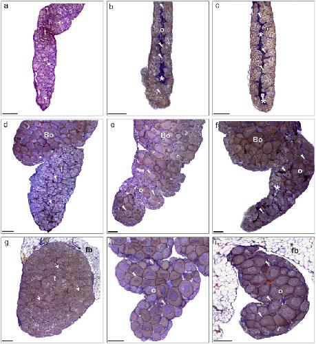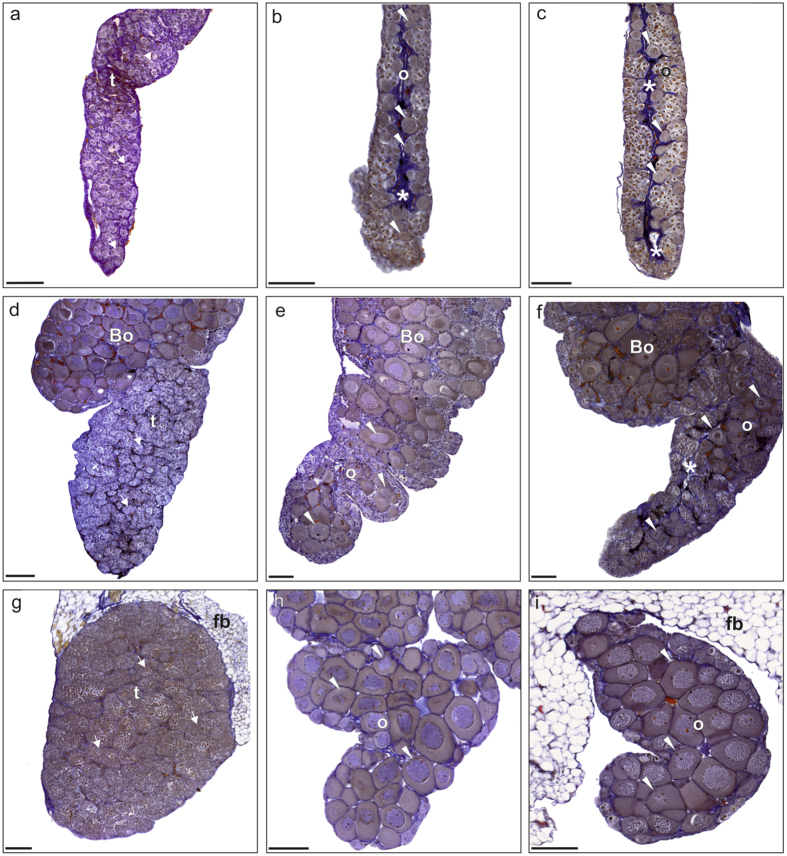 Figure 2. Histological sections of three anuran species under the influence of 17α-ethinylestradiol (EE2).(aâc) Normal male, normal female and phenotypically sex-reversed gonad of African clawed frog (Xenopus laevis). (dâf) Normal male, normal female and phenotypically sex-reversed gonad of European green toad (Bufo viridis). (gâi) Normal male, normal female and phenotypically sex-reversed gonad of European tree frog (Hyla arborea). Bo â Bidderâs organ, characteristic of bufonid gonads (for details: Methods); fb â fat body; o â ovary; t â testis; arrows indicate seminiferous tubules; *ovarian cavity; arrowheads â diplotene oocytes. Scale bars are 100 micrometers.