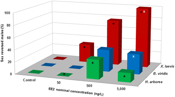 Figure 1. Quantities of sex reversal (contradiction between genetic and phenotypic sex) under the influence of 17α-ethinylestradiol (EE2) in three deeply diverged anuran amphibians.Percentages of genetic-male-to-phenotypic-female sex reversal in African clawed frogs (Xenopus laevis, red), European tree frogs (Hyla arborea, green), and European green toads (Bufo viridis, blue) exposed to three concentrations of EE2 and in control animals; pooled data from two replicate experiments for each treatment or control. Susceptibility differences in genetic-male-to-phenotypic-female sex reversal occurred at all concentrations: (*) significant differences between clawed frogs and tree frogs (p ≤ 0.010); (x) significant differences between clawed frogs and green toads (p ≤ 0.001). Statistical analyses were conducted using cross-tabulation, Chi square and Fisher´s exact tests (α = 0.05).