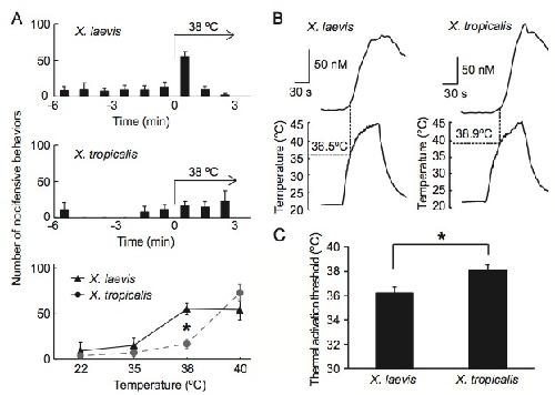 FIGURE 1. Behavioral responses to heat and thermal sensitivity of sensory neurons differ between X. laevis and X. tropicalis