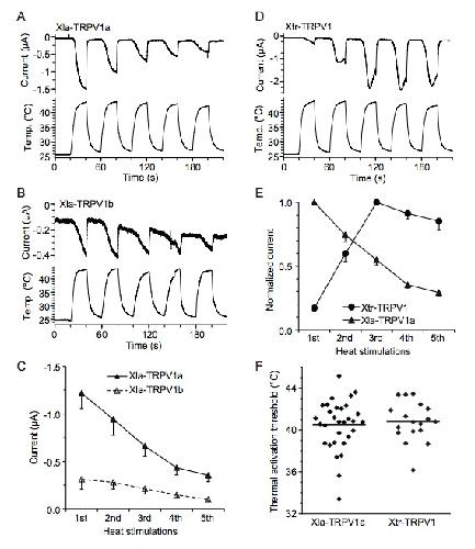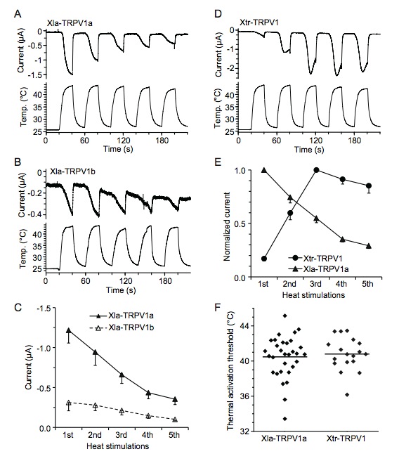 (A, B, and D) Representative traces for current and temperature in Xenopus oocytes expressing X. laevis (Xla) TRPV1a (A), Xla-TRPV1b (B), and X. tropicalis (Xtr) TRPV1 (D) in response to repeated heat stimulation. (C) Average current amplitudes elicited by Xenopus oocytes expressing Xla-TRPV1a (n = 11) or Xla-TRPV1b (n = 12). For each channel, the same amount of cRNA was injected into the Xenopus oocytes and current measurements were performed 3 days post-injection with three independent preparations. Current amplitudes for Xla-TRPV1a were significantly larger than those for Xla-TRPV1b (two-way repeated measures ANOVA, p < 0.01). (E) Current amplitudes elicited by repeated heat stimulations were normalized to the maximum currents (the first and third heat stimulation for Xla-TRPV1a and Xtr-TRPV1, respectively) obtained from Xenopus oocytes expressing Xla-TRPV1a (n =