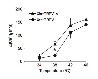 FIGURE 3. Species differences in heat response of TRPV1 between the two Xenopus species