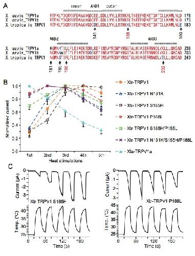 FIGURE 6. A single amino acid substitution is involved in the species differences in TRPV1 heat responses in Xenopus