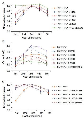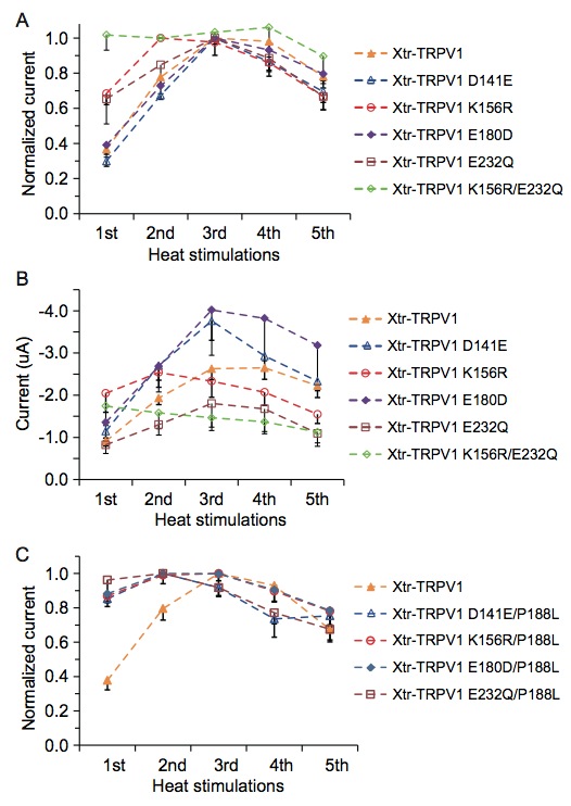 (A) Normalized currents elicited by repeated heat stimulation in Xenopus oocytes expressing Xtr-TRPV1 mutants (n = 16 or 19 for Xtr-TRPV1, n = 12 or 13 for Xtr-TRPV1 D141E, n = 14 for Xtr-TRPV1 K156R, n = 12 for Xtr-TRPV1 E180D, n = 12 or 14 for Xtr-TRPV1 E232Q, n = 14 or 15 for Xtr-TRPV1 K156R/E232Q). The currents were normalized to the maximum average current among five heat stimulations for each channel (the second for Xtr-TRPV1 K156R and Xtr-TRPV1 K156R/E232Q; the third for Xtr-TRPV1, Xtr-TRPV1 D141E, Xtr-TRPV1 E180D, and Xtr-TRPV1 E232Q) (B) Average current amplitudes elicited by repeated heat stimulation in Xenopus oocytes expressing Xtr-TRPV1 mutants (n = 11 or 14 for Xtr-TRPV1, n = 7 or 8 for Xtr-TRPV1 D141E, n = 9 for Xtr-TRPV1 K156R, n = 7 for Xtr-TRPV1 E180D, n = 8 for Xtr-TRPV1 E232Q, n = 9 or 10 for Xtr-TRPV1 K156R/E232Q). For each of the channels, the same amount of cRNA was injected into the Xenopus oocytes and current measurements were performed 3 days post-injection. (C) Normalized currents elicited by repeated heat stimulation in Xenopus oocytes expressing Xtr-TRPV1 mutants (n = 5 or 7 for Xtr-TRPV1, n = 4 for Xtr-TRPV1 D141E/P188L, n = 4 for Xtr-TRPV1 K156R/P188L, n = 4 for Xtr-TRPV1 E180D/P188L, n = 4 or 5 for Xtr-TRPV1 E232Q/P188L). The currents were normalized to the second stimulation except for Xtr-TRPV1 in which currents were normalized to the third stimulation.