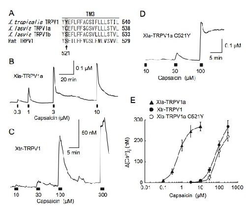 Xla-TRPV1a. (B-D) Representative traces of dose-dependent changes in [Ca2+]i in HeLa cells expressing Xla-TRPV1a (B), Xtr-TRPV1 (C), and Xla-TRPV1a C521Y (D) mutants in response to capsaicin stimulation with various concentrations (E, n = 12-21 for Xla-TRPV1a, n = 9-13 for Xtr-TRPV1, n = 10-12 for Xla-TRPV1 C521Y).