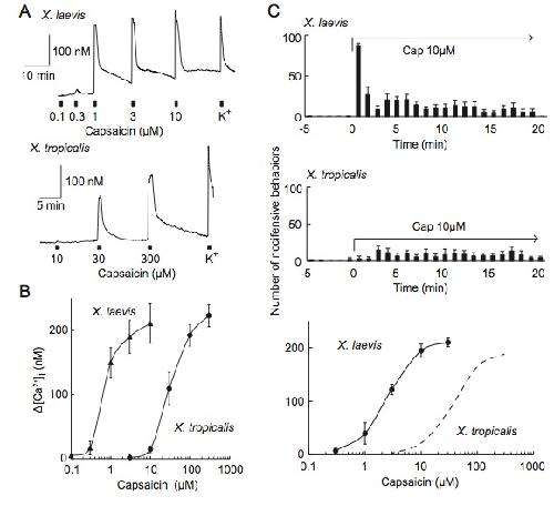FIGURE 10. Species differences in sensory neuron and behavioral responses to capsaicin between the two Xenopus species.
