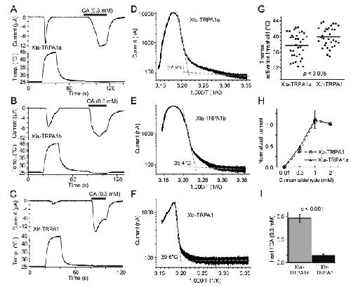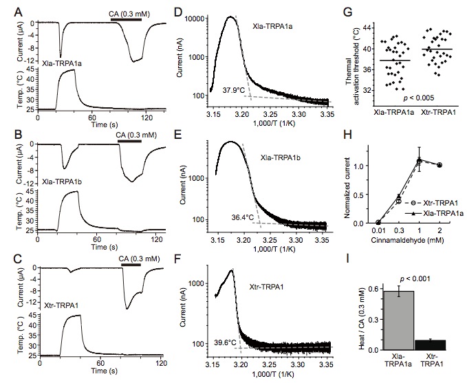 FIGURE 11. The heat response of TRPA1 differs between the two Xenopus species (A-C) Representative traces for current and temperature in Xenopus oocytes expressing Xla-TRPA1a (A), Xla-TRPA1b (B) or Xtr-TRPA1 (C) in response to heat and cinnamaldehyde stimulation. (D-F) Representative Arrhenius plots for Xla-TRPA1a (D), Xla-TRPA1b (E), and Xtr-TRPA1 (F). (G) Thermal activation thresholds for Xla-TRPA1a and Xtr-TRPA1. Dots indicate individual values obtained from different Xenopus oocytes (four independent preparations) expressing Xla-TRPA1a (n = 34) or Xtr-TRPA1 (n = 32; unpaired t-test with p < 0.005). (H) Dose-dependency of Xla-TRPA1a or Xtr-TRPA1 in response to cinnamaldehyde (each data point consists of 4-11 observations). (I) Normalized heat-induced currents for Xla-TRPA1a and Xtr-TRPA1. Heat stimulation was applied following 0.3 mM cinnamaldehyde stimulation as shown in panels A and C. The current amplitude elicited by heat was normalized to that of cinnamaldehyde (Xla-TRPA1a: n =29; Xtr-TRPA1: n = 38; four independent preparations; unpaired t-test with p < 0.001).